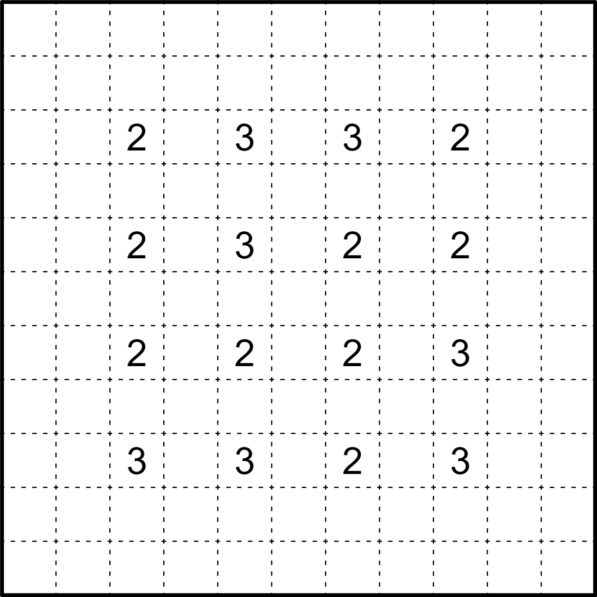 Divide the grid into square regions of orthogonally connected cells. A number indicates the side length of the square it’s in. Region borders may not form any four-way intersections.